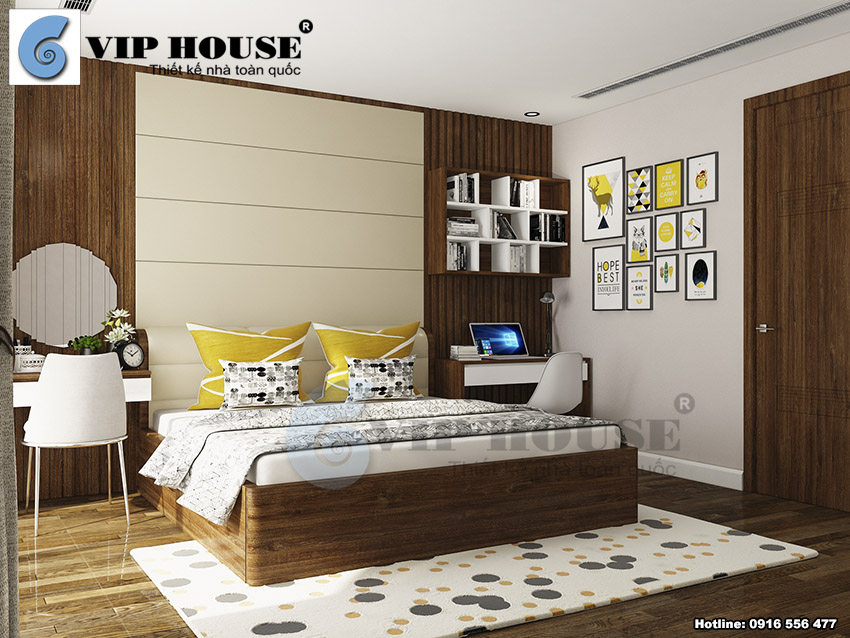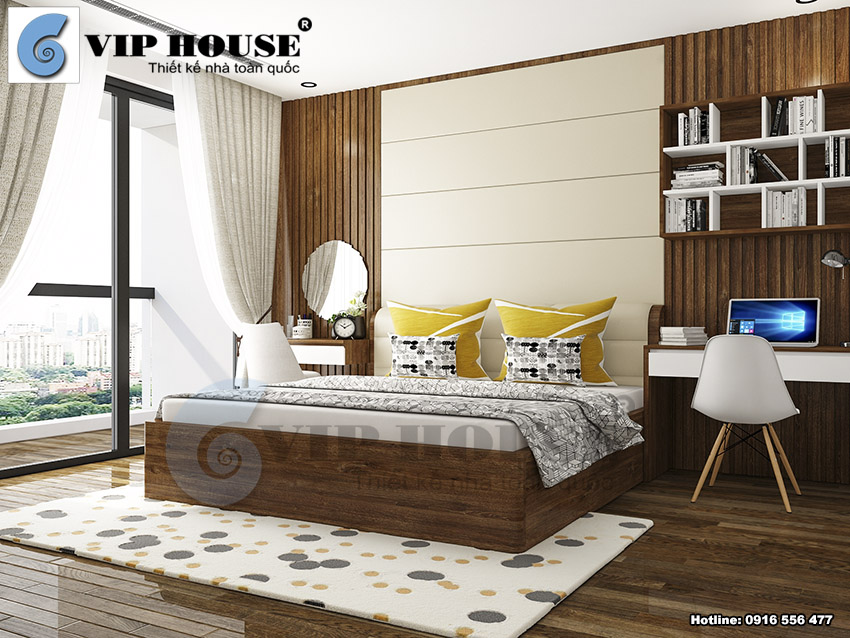 Thiết kế nội thất hiện đại phòng ngủ master được kts thiết kế sử dụng sắc trắng kết hợp màu gỗ là màu sắc chủ đạo. Thiết kế giường ngủ đồng bộ với bàn trang điểm và kệ trang trí đầu giường là yếu tố làm nên điểm độc đáo cho nội thất phòng ngủ này.