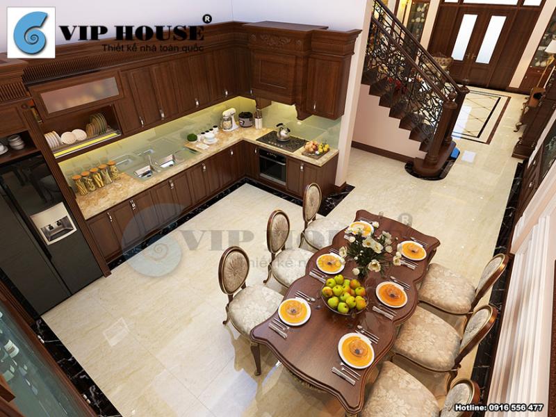 Khu vực bếp nấu của gia đình còn có sự xuất hiện của tủ rượu sang trọng mang đến sở thích và hứng thú cho gia chủ. Căn phòng bếp ăn gọn gàng, sang trọng và ngăn nắp thoáng hương vị của phong cách châu Âu cổ điển xa hoa.Xem thêm về công trình tại Thiết kế nhà phố cổ điển Pháp 4 tầng tại Vĩnh Phúc.