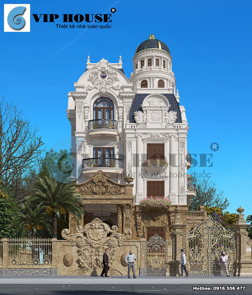 Căn biệt thự nguy nga lộng lẫy được thiết kế tỉ mỉ bắt mắt. Người xem chắc chắn sẽ ấn tượng bởi kiến trúc mái cong vòm, bán nguyệt đặc trưng của kiến trúc lâu đài, cung điện cổ điển châu Âu.