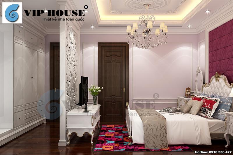 Kiến trúc sư Vip House đã đặt một tấm ngăn CNC tạo nên không gian riêng cho không gian tủ quần áo và giường ngủ. Thiết kế nội thất phòng ngủ tân cổ điển dành cho con gái đẹp một cách dịu dàng và bất ngờ.