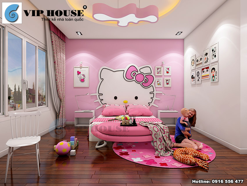 Thiết kế nội thất hiện đại phòng ngủ con gái với đèn trần hình dáng ngộ nghĩnh, những bức tranh chủ đề siêu dễ thương được các kts bố trí vào căn phòng cùng với những đồ vật lấy ý tưởng từ các nhân vật hoạt hình làm cho căn phòng của bé thật sinh động và đáng yêu.